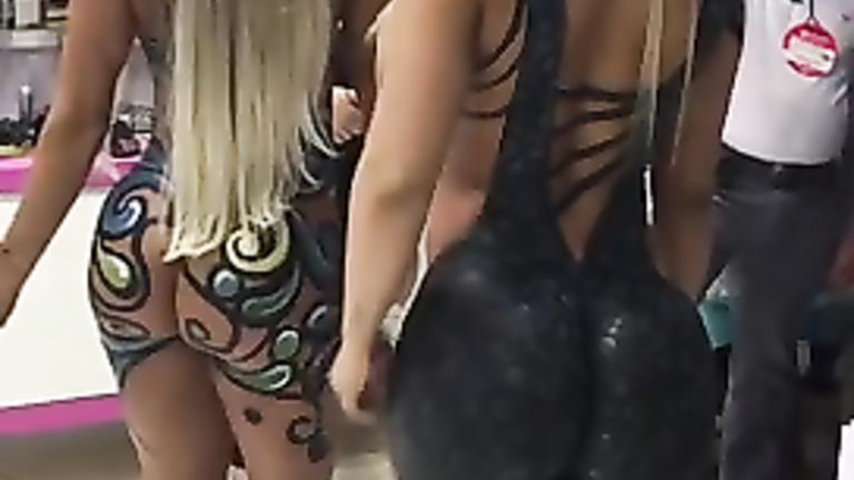 Promoting the Olympic Games in Rio 2016, two hot and curvaceous blondes with painted bodies exposed two pairs of giant jiggling buttocks and huge bouncing boobs.